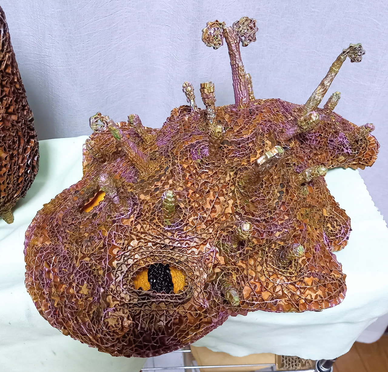 ハルザメは、「粘菌(変形菌)」に関する本を読んだ時に、イメージが湧いて作った作品です。森の中をゾロゾロとアメーバーのように這って移動する生き物。背中にいろんな植物を生やしていて、それがいろんな場所で種を落として、植物の生息域を広げているのです。