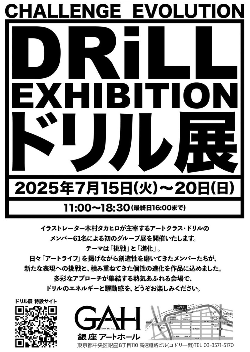 イラストレーター木村タカヒロが主催するアートクラス・ドリルのメンバー61名による初のグループ展です。テーマは「挑戦」と「進化」。多彩なアプローチが集結する熱気あふれる会場で、ドリルのEnergieと躍動感をお楽しみください。